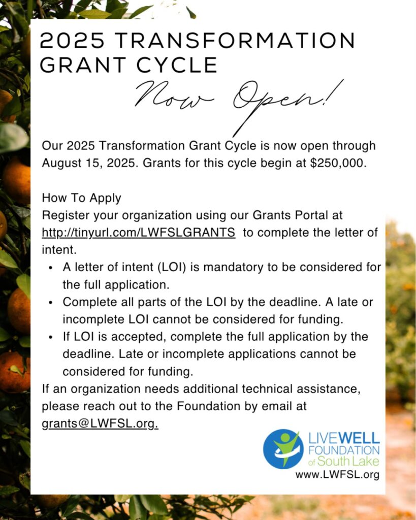 The Live Well Foundation of South Lake is pleased to announce the opening of the 2025 Transformation Grant cycle. We invite nonprofit organizations with bold, innovative ideas to partner with us in creating sustainable solutions that advance health and well-being across South Lake County.